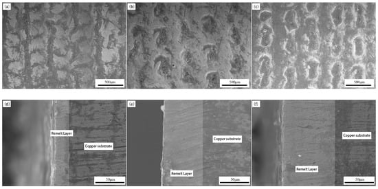 Figure 2 shows the surface and cross-sectional morphology of the sample when the energy density is kept at 132.69 J/mm2 and the pulse width is kept constant for 10 ms, and the laser pulse frequency is changed separately. As shown in Figure 2a, when the pulse frequency is 5 Hz, the laser generates regular molten spots on the copper surface, but the overall number of molten spots is relatively small, and the separation between the molten spots leads to the presence of untreated areas. When the pulse frequency is 10 Hz (Figure 2b), the surface of the sample presents a continuous strip of molten spots. The overlapping of the melting spots presents a fish scale-like hierarchical structure as a whole. The surface of the sample is flat and completely covered by the molten spot. When the pulse frequency is 15 Hz (Figure 2c), there are obvious banded pits on the sample surface, the outline of the circular melt spot becomes blurred, and the hierarchical structure of fish scales disappears. Comparing Figure 2d–f, it can be seen that when the frequency is 5 Hz, the thickness of the remelted layer is relatively thin, about 20 μm. When the pulse frequency is 10 Hz and 15 Hz, the thickness of the remelted layer increases to about 30 μm, but the thickness of the remelted layer of the sample is more uniform at 10 Hz.