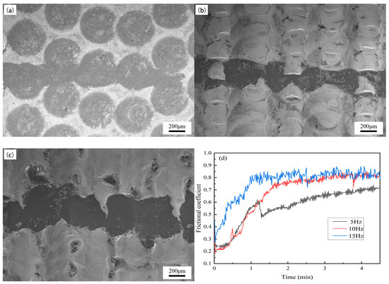 Figure 8 shows the surface morphology and friction curve of the worn samples under different frequencies. By comparing the wear marks in Figure 8a–c, it can be seen that the wear form on the sample surface is adhesive wear. As the laser frequency increases, the degree of wear on the sample surface first decreases and then increases. When the frequency is 5 Hz, the sample surface presents relatively uniform strip-like abrasions, with a width of approximately 260 μm. When the frequency increases to 10 Hz and 15 Hz, the wear marks of the sample surface are gourd-shaped. The widest point is located at the overlapping position between adjacent columns, with a width of approximately 230 μm and 490 μm. The narrow point is located at the center of the same column, with a width of approximately 120 μm and 200 μm.