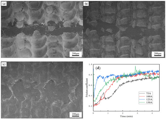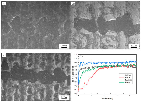 Figure 9 shows the surface morphology and friction curve of the worn samples under different pulse width parameters. From the figure, it can be seen that as the pulse width increases, the gourd-shaped wear marks on the sample surface gradually disappear and transform into a straight line. When the pulse width is 7.5 ms, there are multiple continuous strengthening layers after wear, and the remelted layer is not completely worn. When the pulse width is 12.5 ms, the width of the wear marks is large, and the remelted layer is almost completely lost. When the pulse width continued to increase to 15 ms, compared to Figure 9b, the overall width of the wear marks slightly decreased. The phenomenon of spalling of the remelted layer is observed in both Figure 9b,c.