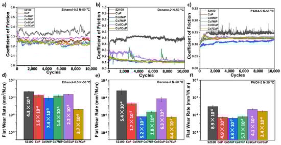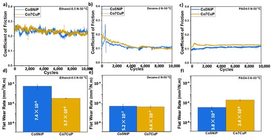 Coefficient of friction of Co5NiP and Co7CuP in (a) ethanol at 0.5 N, (b) decane at 2 N, and (c) PAO4 at 5 N. The flat wear rate values in (d) ethanol at 0.5 N, (e) decane at 2 N, and (f) PAO4 at 5 N at 50 °C.
