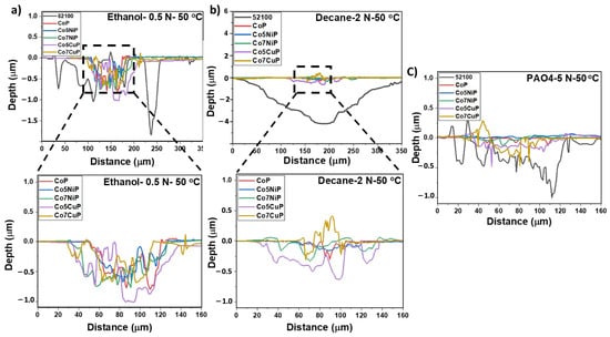 The results obtained with optical profilometry (Figure 3) affirm the findings presented in Figure 2. Regarding the wear track depth, the uncoated steel displays a significant wear profile with a depth of approximately 4 μm when tested in decane (Figure 3b). In contrast, CoMeP coatings yield comparatively shallow wear tracks, with a depth measuring below 1 μm in (Figure 3a,b), where Me is the catalytic metal added to the amorphous CoP matrix.