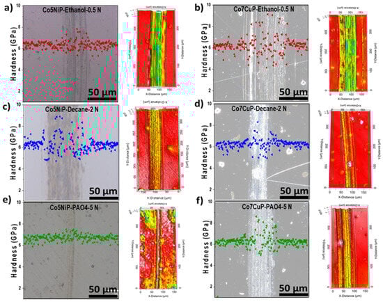 Nanoindentation hardness mapping on the wear tracks for Co5NiP in (a) ethanol, 0.5 N, (c) decane, 2 N, (e) PAO4, 5 N tests; and Co7CuP for (b) ethanol, 0.5 N, (d) decane, 2 N, (f) PAO4, 5 N tests. 3D images generated by the optical profilometer.