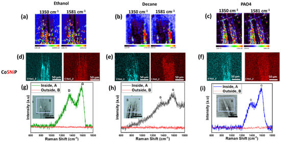 (a–c) Raman maps of Co5NiP wear track in ethanol, decane, and PAO4; (d–f) EDS maps of Co5NiP wear track in ethanol, decane, and PAO4; (g–i) Raman spectra (with characteristics D and G carbon peaks) inside the wear track of Co5NiP in ethanol, decane, and PAO4. The points A and B used for collecting spectra inside and outside the weartracks are highlighted in the SEM images included as insets.