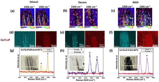 (a–c) Raman maps of Co7CuP wear track in ethanol, decane, and PAO4; (d–f) EDS maps of Co7CuP wear track in ethanol, decane, and PAO4; (g–i) Raman spectra (with characteristics D and G carbon peaks) inside the wear track of Co7CuP in ethanol, decane, and PAO4. The points X and Y used for collecting spectra inside and outside the weartracks are highlighted in the SEM images included as insets.