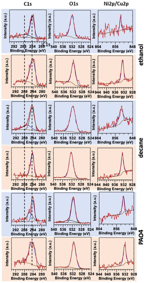 XPS analysis of the wear tracks formed on Ni-based (highlighted in blue) and Cu-based (highlighted in orange) samples in different environments.