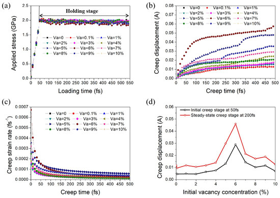 (a) Different stress levels applied on nanocrystalline Ni with different volume fractions of initial vacancies with loading time. Variations in (b) creep displacement and (c) creep strain rate with time under loading stress of 2 GPa and temperature of 800 K. (d) Variation in creep displacement with initial vacancy concentration at creep times of 50 and 200 fs.