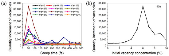 (a) Variation trend of the increment of vacancy concentration with time during the deformation process of each model. (b) Variation in the quantity increment of vacancies at 50 fs with varying initial vacancy concentration.