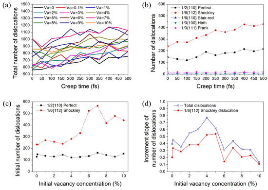 The increment slope of the number of dislocations in the creep process can be obtained from the relationship between the number of dislocations and the creep time. The variation in the increment slope of the total number of dislocations and the 1/6{112} Shockley partial number of dislocations with initial vacancy concentration of nanocrystalline Ni in the steady-state creep stage is exhibited in Figure 4d. It was found that the increment slope of the number of dislocations firstly increased with initial vacancy concentration and then decreased, reaching the maximum when the initial vacancy concentration was about 4%. This was consistent with the significant increase in creep displacement when the initial vacancy concentration exceeded 4% (as shown in Figure 2c).