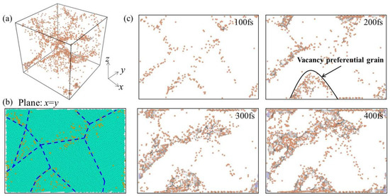 In order to further explore the distribution of deformation-induced vacancies that were generated during creep, the distributions of vacancy increment for nanocrystalline Ni with 1% vacancies were carefully examined. Figure 5a shows the three-dimensional distribution of the deformation-induced vacancies at creep time of 50 fs, where the vacancies are represented by orange dots. For a clear presentation, atoms of the model are removed to highlight the distribution of vacancies. It can be seen that the distribution of vacancies was not evenly distributed in the model. The distribution of the deformation-induced vacancies on the two-dimensional x = y plane is exhibited in Figure 5b,c. It can be seen that the vacancies generated in the deformation process were basically distributed along the GB, as shown by the blue dotted line along the GBs in Figure 5b. Slices with a thickness of 1 nm along the x = y plane of generated vacancies at 100, 200, 300, and 400 fs are shown in Figure 5c. With the extension of creep time, new vacancies gradually increased, which is consistent with the results in Figure 3a. The newly formed vacancies preferentially formed at the GB and in some grains with specific orientation.
