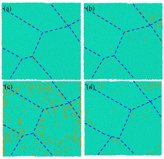 The relationship between the distribution of deformation-induced vacancy and the concentration of initial vacancy in nanocrystalline Ni at the creep time of 50 fs is shown in Figure 6. Figure 6a–d corresponds to the initial vacancy concentrations of 0.1%, 3%, 6%, and 10%. It can be seen that the deformation-induced vacancies were still mainly distributed around the GBs. The number of deformation-induced vacancies increased with increasing initial vacancy concentration and reached the maximum when the initial vacancy was 6% at creep time of 50 fs, which is consistent with the results in Figure 3b.