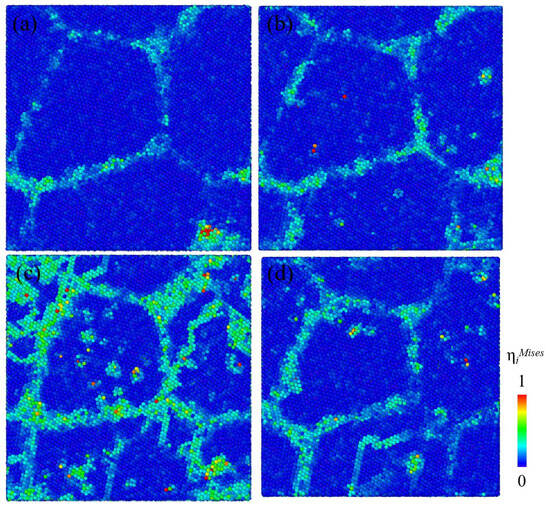 To explore the reason why the vacancies generated by creep were preferentially distributed at the GB, the von Mises shear strain ηiMises of each atom was calculated to mark the areas with large local shear strain in the nanocrystalline Ni models. Shear strain distribution of nanocrystalline Ni models with initial vacancy concentration of 0.1%, 3%, 6%, and 10% at creep time of 50 fs is shown in Figure 7a–d. The local shear strain at the GB was the largest compared to that of the grain interior, that is to say, the atomic activity at the GB was more intense than that of the grain interior. In addition, there were still some regions with large local shear strain in the grain interior, which may be related to the average distribution of initial vacancy sites. It can be concluded that the generation of deformation-induced vacancies is directly related to the large atomic shear strain at the GBs.