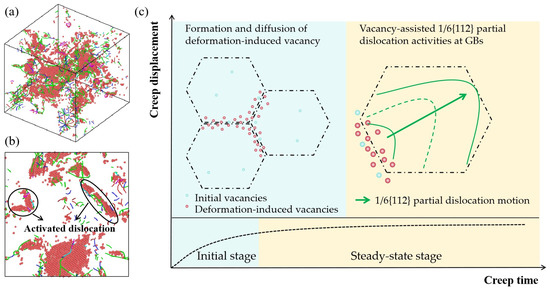 A schematic diagram of the creep deformation mechanism of nanocrystalline Ni is shown in Figure 8c. As the structural weakest region in the crystal, the GB and initial vacancy first underwent local atomic deformation in the creep process. The initial vacancy at the GBs provided favorable conditions for the nucleation of partial dislocations during creep, while the increment of the number of dislocations could also cause the new formation of vacancies at the GBs. During creep, the partial dislocations were activated by the local larger shear strain at the GBs, and deformation-induced vacancies were consequently formed. The newly generated vacancies at the GBs further promoted the formation of partial dislocations at the GBs. This can be verified from Figure 4b, where the number of 1/6{112} Shockley partial dislocation kept increasing during both the initial creep stage and the steady-state creep stage. Vacancies can not only induce the generation of partial dislocations but also assist in the slip of partial dislocations. At high temperatures, vacancies gradually diffused into partial dislocations, and a row of atoms at the dislocation line absorbed vacancies due to thermal motion. The dislocation line moved upward by a slip plane, causing the dislocation to climb onto adjacent slip planes, thereby inducing further creep deformation. Therefore, the creep deformation mechanism of nanocrystalline Ni in the initial stage of creep was mainly dominated by the deformation-induced vacancy formation and diffusion. In the steady-state creep stage, the creep deformation mechanism of nanocrystalline Ni was dominated by the vacancy-assisted 1/6{112} Shockley partial dislocation activities at the GBs.