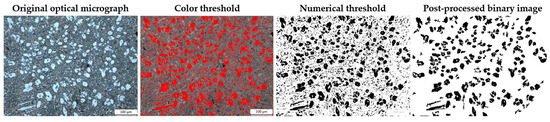 Image post-processing sequence to evaluate the edge-to-edge distance between carbides: original optical micrograph, color threshold value setting, numerical threshold setting, and post-processed binary image.