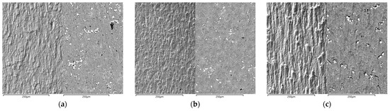 The SEM analyses of the worn surfaces for the AR, HT1, and HT2 conditions are summarized in Figure 6 and Figure 7 for the UF and M powders, respectively. The low-magnification SEM micrographs (Figure 6a–c and Figure 7a–c) report the SEI-SEM image on the left and the BSE-SEM image on the right. By comparing the worn surfaces of the HCCIs eroded by UF powder (dmean = 4.8 µm), see Figure 6, with the ones eroded by M powder (dmean = 25.5 µm), see Figure 7, the contribution of the mean diameter of the erodent appeared predominant to the substrate conditions. Remarkable and wide surface damage can be detected (see Figure 6), and the particles’ flow direction (from the top to the bottom of each image) can be identified (see the SEI-SEM images of Figure 6a–c).
