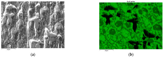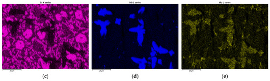 Concerning the analysis of the worn surfaces of the HCCIs eroded by M powder (Figure 7), the particles’ flow direction was not detectable, and all the surfaces appeared uniformly damaged. The BSE-SEM observations suggest that the worn surfaces eroded by M powder, see Figure 7a–c, contain a higher amount of NbC carbides with respect to the worn surfaces eroded by UF powder, see Figure 6a–c. From the blow-ups of Figure 7d–f, the role of Cr-rich and Nb-rich carbides was deepened: due to the higher erodent’s particle dimension, the impact on the substrate was faced by a greater number of carbides, and thus, each of these was subjected by a lower amount of energy. From the EDS elemental maps of the worn surfaces of the HT1 condition eroded by UF powder (Figure 9), the contribution of the mean particle diameter is predominant to the microstructural changes, as also confirmed in the above-reported ER outcomes.