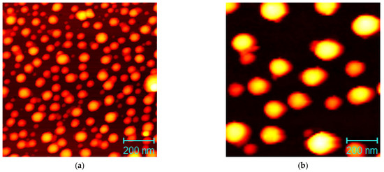 Figure 4a–d show images of the nanoparticles grown after annealing Ag #2 (6 nm) and Ag #3 (12 nm) films at 440 °C, along with their respective nanoparticle size distribution diagrams. In Figure 4a, the surface morphology of an Ag #2 film after annealing is depicted, revealing a bimodal distribution of scattered spherical nanoparticles and several agglomerates. The mean NP diameter values for each peak are 35 and 65 nm. Figure 4b shows an AFM image of an Ag #3 film’s morphology after annealing. A bimodal distribution of NPs is observed once more, with a limited number of agglomerates. Here, the average NP diameter values for each distribution peak are 110 nm and 169 nm. It is evident that the thicker film led to much larger nanoparticles and a wider NP size distribution.