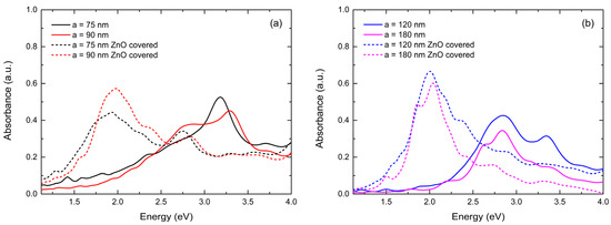 Case (i) is depicted in Figure 8a,b. Concerning the non-coated Ag NPs, the main LSPRs for smaller lattice constant (a) values, i.e., denser NP distributions, were located at 3.18 and 3.29 eV, yet for the two bigger lattice constant values they were located at 2.84 and 2.85 eV. As for the secondary LSPRs, in the cases of a = 75 nm and a = 120 nm, they were located at higher energies compared to the main LPSRs, while for a = 90 nm and a = 180 nm, they were found at lower energies. For a = 75–120 nm, secondary LSPRs could be located around 3.7 eV, which in the cases of a = 90 and a = 120 nm could be considered third resonances. Notably, for a = 180 nm, four peaks were evident, with the two minor ones being found around 3.15 and 3.35 eV. Furthermore, for ZnO-coated NPs, a significant red shift can be observed for all LSPRs in all studied subcases. Additionally, the ZnO capping layer seems to have caused the absorbance peaks to become broader in some cases, as seen for a = 75 nm in Figure 8a, and sharper in others, as illustrated in Figure 8b. Moreover, more minor peaks or curvatures that cannot be considered LSPRs appeared in the absorbance curves. This observation is further explained below in the discussion section. The amplitude of the main LSPRs was slightly decreased for a = 75 nm, while for the remaining lattice constant values it increased. Lastly, an amplitude enhancement also occurred for well-defined secondary LPSRs.