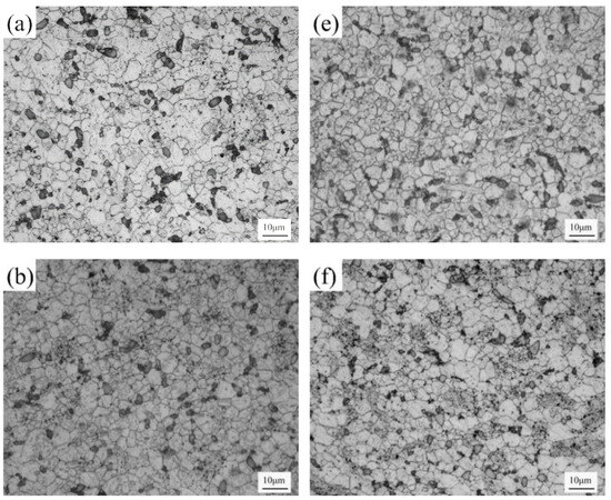 Figure 2 shows the microstructure perpendicular to the extrusion direction of the alloys with different Gd/Nd ratios. The microstructures of both as-extruded and as-aged alloys are mostly composed of bright, fine equiaxed α-Mg recrystallized grains, grey secondary phase grains at matrix grain boundaries, and tiny precipitates. Some large grains can be observed in E-alloy 0, which are free from dynamic recrystallization [25]. With the increase in Gd/Nd ratio, the microstructure of the as-extruded alloys becomes more uniform with less long elongated grains and secondary phase, and the grain size shows an invisible difference, which is in the range of 3~6 μm. Compared with the as-extruded alloys, the grain size in T5-alloy 0 reduces due to static recrystallization, and the grain sizes of the T5-alloy 2 and T5-alloy 3 become coarser than those of the as-extruded alloys.
