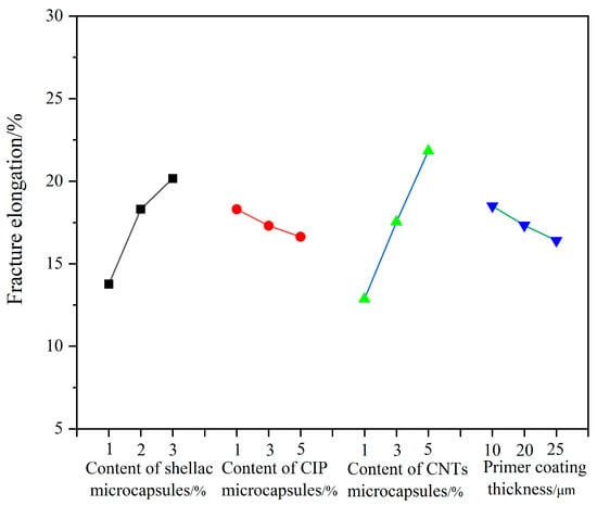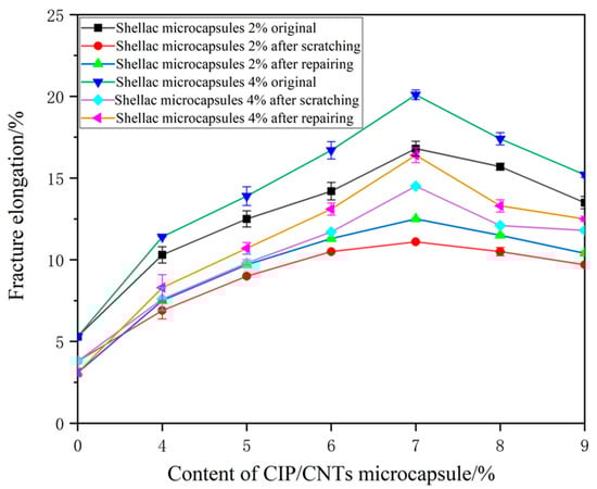 | Content of Shellac Microcapsules (%) | Content of CIP/CNT Microcapsules (%) | Fracture Elongation (%) | Repair Rate (%) | ||