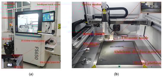 (a) Photograph of FS650 ultrasonic atomization spraying machine body and ISPLab Syringe Pump; (b) internal structure and spraying device of ultrasonic atomization spraying machine.