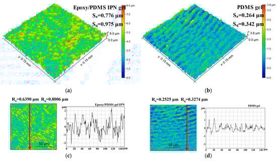 3D optical profile images of (a) the epoxy/PDMS IPN gel and (b) PDMS gel. Scan size: 0.15 mm × 0.15 mm. Surface profiles of (c) the epoxy/PDMS IPN gel and (d) PDMS gel. The red arrows are the sampling paths for Ra and Rq.