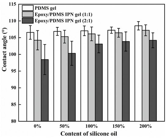 It is known that surface wettability can affect the ice adhesion strength []. To study the wettability of different surfaces, we measured the contact angle (CA) of the coating with the change in silicone oil content. In Figure 7, these samples had CAs ranging from 95° to 110°, which is similar to the previous measurements []. When the level of silicone oil was held constant, there was a decrease in CA with an increase in the level of epoxy. Additionally, with a high level of silicone oil, the decrease in the contact angle’s trend slowed. The CA of the three coatings increased in a monotonic fashion with the increase in silicone oil content, indicating their hydrophobic nature due to the silicone components (PDMS and silicone oil). The order of CAs for the coatings is as follows: PDMS gel > epoxy/PDMS IPN gel (1:1) > epoxy/PDMS IPN gel (2:1). This is attributed to the epoxy component increasing the surface energy of the system. Overall, the CA of the epoxy/PDMS IPN gel (1:1) remains relatively constant and is not responsible for the observed decrease in τice.
