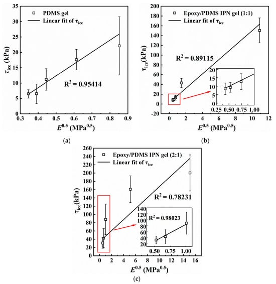 It can be observed from Figure 4 and Figure 8, that τice and E decreased simultaneously and significantly with increasing silicone oil content. Figure 9 shows the relationship between E0.5 and τice for (a) PDMS gel and the epoxy/PDMS IPN gel ((b) 1:1 and (c) 2:1). τice shows a strong linear relationship with E0.5 for the PDMS gel and epoxy/PDMS IPN gel (1:1). For the epoxy/PDMS IPN gel (2:1), τice also shows a linear relationship with E0.5 when E0.5 is small (see red boxes in Figure 9c). This result was consistent with Equations (1) and (2) in Section 1, which showed that τice is proportionate to E0.5. In summary, the reduction in τice is positively related to the modulus of the coating. The lower the elastic modulus, the lower the τice. The mechanism of this phenomenon is considered from the perspective of fracture mechanics. Due to the low elastic modulus of the coating, when the ice cube is subjected to an external force, the soft coating can store more elastic strain energy, making it possible to detach the ice–coating interface. This provides a higher strain energy release rate for interface crack propagation. At the same time, due to the strong deformation ability of the soft coating, when the ice cube is subjected to external force, the ice–coating interface is more likely to cause local debonding at the edge, resulting in a smaller debonding external force (ice adhesion strength). The research of He and Adja et al. [,] also verified this mechanism.