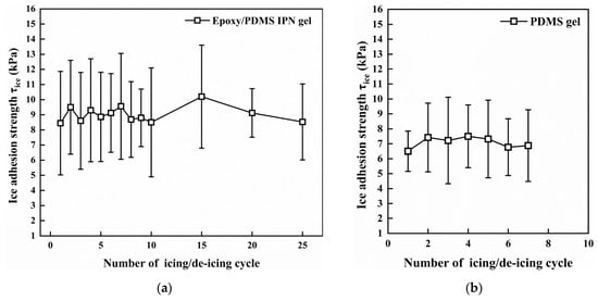 The icing/deicing cyclic test results are shown in Figure 10. In 25 icing/deicing cyclic tests, the τice of epoxy/PDMS IPN gel coating was stable (within the range of 3–14 kPa). There were no visible cracks or flaking after 25 cyclic tests. This indicates that the durability of the epoxy/PDMS IPN gel is reliable. For the PDMS gel coating, debonding occurred after approximately seven cyclic tests.