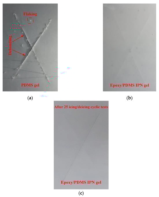 X-cut adhesion test for (a) PDMS gel, (b) epoxy/PDMS IPN gel, and (c) after 25 icing/deicing cyclic tests epoxy/PDMS IPN gel coatings.