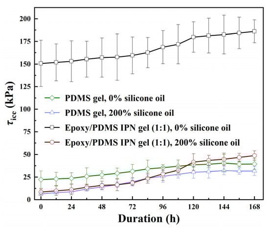 The ice adhesion strength τice of the epoxy/PDMS IPN gel and PDMS gel coatings with the change in the coating duration of the neutral salt spray environment.