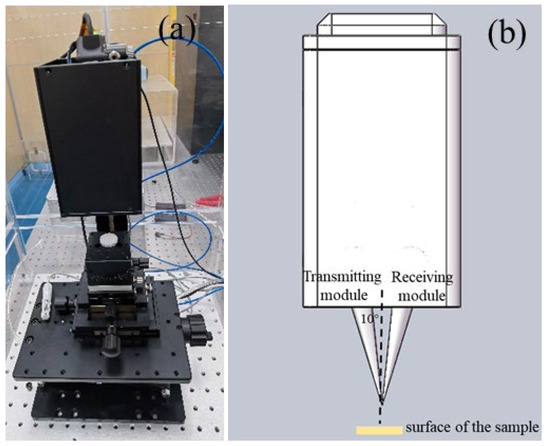 The TBC samples were ultrasonic cleaned to remove the influence of impurities and pollutants. And a reflection module with an incident angle of 10° was configured for the terahertz time-domain spectrometer (Teraflash_TF-1927, TOPTICA Photonics, Munich, Germany, Figure 1). The sample table was constructed as a 360° adjustable rotating platform to facilitate testing of different sample positions. The reflection module and the sample table were placed in an acrylic, atmospheric-sealed box measuring 45 cm × 45 cm × 70 cm. An aluminum alloy optical platform was placed on the bottom, and two KF25 holes were reserved for the passage of high-purity nitrogen (99.999%), which were used to control the internal humidity below 5% and reduce the interference of water vapor on the terahertz signals of the samples. In addition, an infrared locator and a digital locator were also installed. The infrared locator was horizontally placed beside the reflection module, flush with the probe. The digital locator was used to mark the samples so that the surface of the samples could be placed in the focus position to obtain the maximum terahertz signals. The THz-TDS tests were performed by rotating the sample table to obtain the maximum terahertz signals and marking the test position of the current samples (hereinafter referred to as “T-position”). All the samples are positioned by the infrared positioner, so as to ensure the stability of the received signals. The system parameters are listed in Table 2.