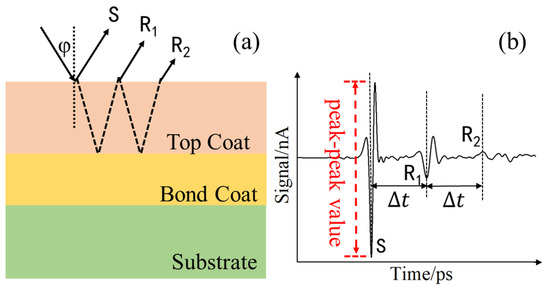 As shown in Figure 2a, terahertz waves reach the surface of samples at an incident angle φ, and S, R1, and R2 correspond to the first three reflected echo signals, respectively. They represent the reflected echoes of terahertz waves that reach the upper surface of the TC, the echoes that are reflected back to the receiver after the terahertz waves pass through the TC to reach the BC interface, and the echoes that continue to be reflected.