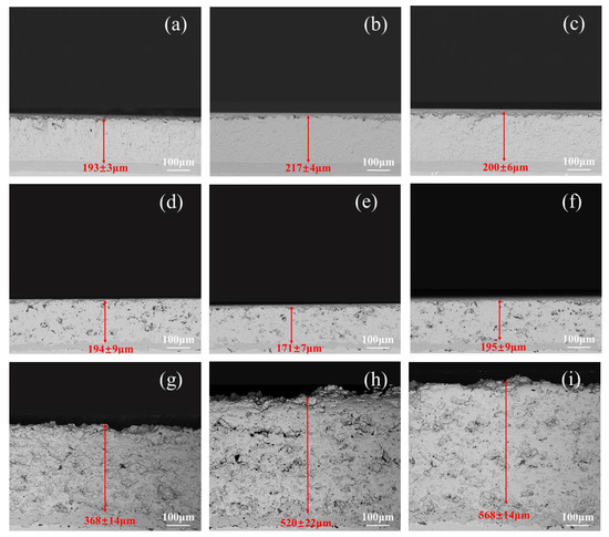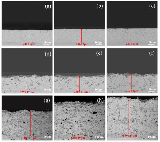 SEM backscattering images of the longitudinal section of the original TBC samples. (a) EB-PVD1; (b) EB-PVD2; (c) EB-PVD3; (d) APS-A1; (e) APS-A2; (f) APS-A3; (g) APS-B1; (h) APS-B2; (i) APS-B3.