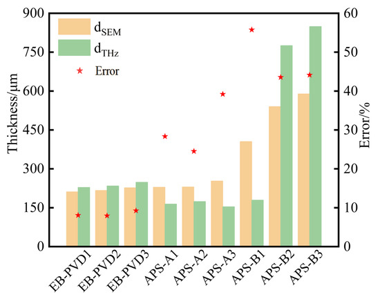 It was found that the errors of the samples prepared by EB-PVD are below 10%, while the errors of the APS samples range from 24.5% to 55.8%, respectively (as shown in Figure 4).
