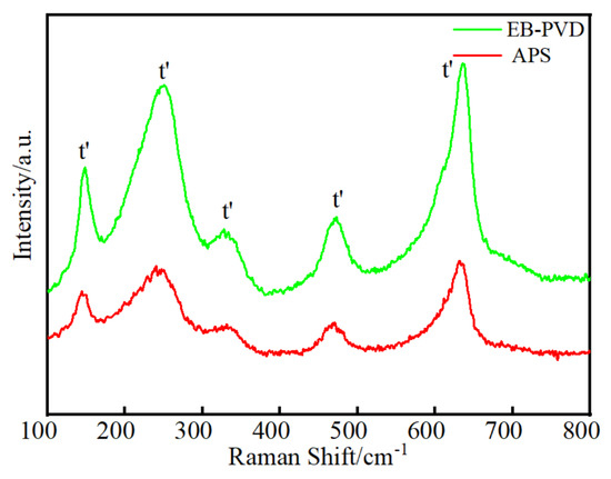The test results of EB-PVD samples in this study were consistent with the results of the thickness error of about 10% reported in Fukuchi T. et al. [18], while the data of APS samples showed a large error distribution. In order to investigate the thickness errors of the THz method for the coatings prepared by the two technologies, the phases of the samples prepared by the two technologies were detected first. The Raman spectra of the samples were tested using a high-resolution laser Raman spectrometer, as shown in Figure 5.