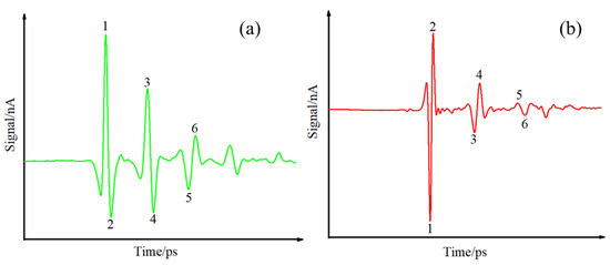 In addition, the terahertz time domain pulse echo patterns of the EB-PVD and APS samples are also different. Figure 7 gives the typical spectrograms. Numbers 1, 2, 3, 4, 5, and 6 in Figure 7a represent the crest and trough of echo signal S, the crest and trough of echo signal R1, and the trough and peak of echo signal R2, respectively. Numbers 1, 2, 3, 4, 5, and 6 in Figure 7b represent the trough and peak of echo signal S, the trough and peak of echo signal R1, and the peaks and troughs of echo signal R2, respectively. They are arranged on the horizontal axis from left to right.