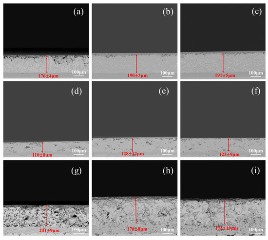 SEM backscattering images of longitudinal sections of TBC samples after first polishing. (a) P1-EB-PVD1; (b) P1-EB-PVD2; (c) P1-EB-PVD3; (d) P1-APS-A1; (e) P1-APS-A2; (f) P1-APS-A3; (g) P1-APS-B1; (h) P1-APS-B2; (i) P1-APS-B3.