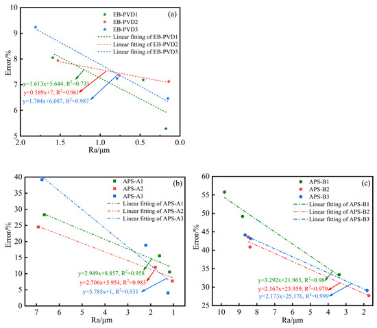 The variation trends of measurement errors of (a) EB-PVD, (b) APS-A, and (c) APS-B samples with surface roughness.