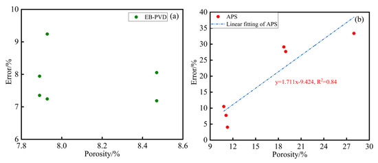 The relationships between porosities and measurement errors of (a) EB-PVD and (b) APS samples.