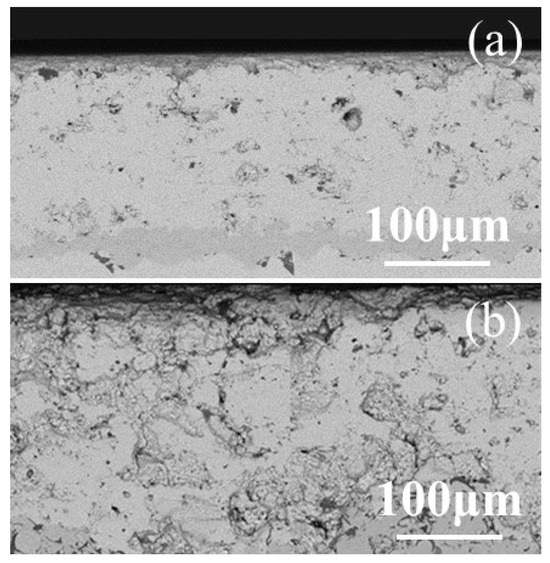 Figure 12 demonstrates that EB-PVD samples depict an absence of a discernible correlation between porosities and errors, primarily attributable to the consistent and stable porosity values within a small distribution range. Conversely, APS samples exhibit a clear linear relationship. The relatively low R2 value in this case is suspected to stem from differing size distributions between the raw powders used for APS samples. Notably, larger powder sizes amplify errors in the APS-B samples. Consequently, Figure 13 displays the typical microtopography of the two groups of APS samples for further analysis.