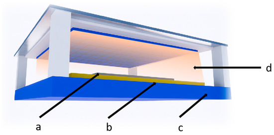 Schematic diagram of the plasma (DBD) generation device. (a) Carbon fiber sample, (b) substrate, (c) worktable, (d) plasma.