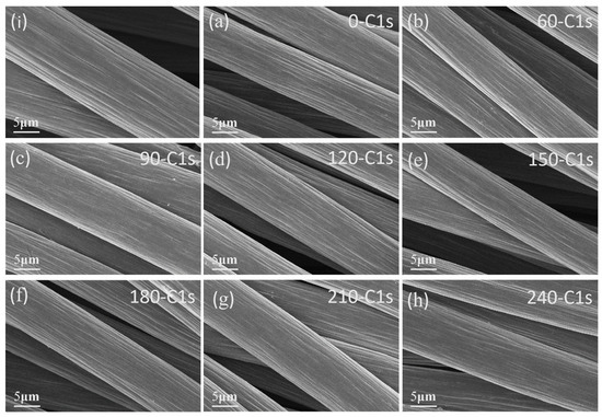 The SEM of the samples after plasma treatment is shown in Figure 2. Additionally, the raw, untreated samples are shown in Figure 2i, which are industrially prepared wet-spun fibers with distinctive smooth and flat stripes and grooves on the surface, which are axially parallel to the fibers on the surface of the samples [18]. The samples are coated with a polymer sizing layer, which protects the samples and facilitates the subsequent processing. A minor amount of contaminants may adhere to the surface during transportation, serving as the primary cause for the presence of impurity particles on the surface. The morphological changes resulting from plasma treatment are depicted in Figure 2a–h. Notably, the surface particles diminish, and the grooves, when compared to the original sample, become slightly clearer. This transformation is primarily attributed to the active particles in the plasma, which act on the sample surface, leading to the degradation and separation of the polymer sizing layer. Consequently, the original groove characteristics of the sample surface fibers gradually emerge. The observed reduction in impurity particles further substantiates the role of plasma in surface cleaning. Additionally, no other significant changes were observed [18,19].