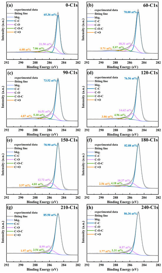 In order to analyze the chemical composition and state of several samples, XPS was performed. C and O are the main elements in the samples. Figure 3 shows the high-resolution C1s spectra of several samples. It can be seen that the most prominent peak is 284.8 eV, relating to C–C. In the corresponding high-resolution spectra of the untreated raw samples, as shown in Supplementary Figure S1, it presents low contents of C–O–C, C–O and C=O, only 3.2%, 7.76% and 1.64%, respectively, which is most likely due to the air surrounding the samples. Figure 3a shows that the C–O–C, C–O and C=O groups on the surface of the sample after 5 min of plasma treatment increased to 7.06%, 21.50% and 6.08%, respectively. With the passage of time, the content of C–O–C, C–O and C=O groups gradually decreased, returning to the state before plasma treatment (the trend is shown in Figure 4). This indicates that the activated carbon atoms and oxygen-containing functional groups on the carbon fiber surface after plasma treatment are unstable. Due to the transient and efficient action of high-energy particles in plasma on the material surface [20], the activated carbon atoms and newly introduced oxygen-containing functional groups may gradually react with air molecules to form carbon dioxide gas and leave the sample surface.