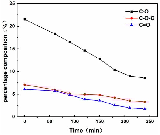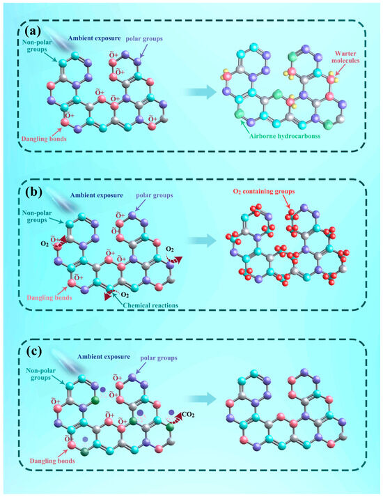 The surface edges of the sample treated with plasma generated many dangling bonds (resulting from the fracture of the sample caused by plasma bombardment). These dangling bonds form an unstable saturated state with the substances in the surrounding air (such as hydrocarbon compounds and water), as shown in Figure 6a. Meanwhile, the defects caused by plasma will also generate charge “traps” (charge holes) [26], which attract the incorporation of free radicals, resulting in charge neutralization [27]. The adsorption of these organic compounds occurs on the surface of carbon fibers. When carbon fibers are exposed to the surrounding environment, the content of O2-containing groups will increase significantly. With the passage of time, the available active sites on the surface (such as dangling bonds) continue to react with substances in the surrounding environment (such as O2) [28,29]. In this continuous reaction, C–H bonds will be replaced by C–O–C and C–O functional groups [30] (Figure 6b). The plasma treatment, being a surface modification technology, results in the generation of some functional groups on the carbon fiber surface that exhibit weak binding affinity. The parts of these functional groups containing O2 will combine with substances in the surrounding environment, resulting in irreversible chemical oxidation reactions to produce CO2 [31], which leaves the carbon fiber surface as a gas (Figure 6c).