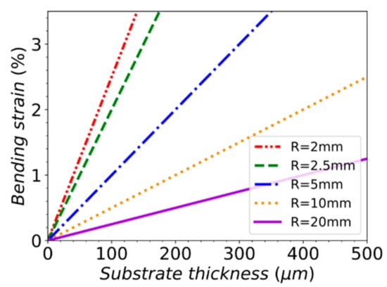 where d is equal to the substrate thickness and R is the bending radius. The proper form of Equation (1) includes the addition of the film thickness; however, in this work the film thickness is negligible for the bending strain. Simply by changing the substrate thickness or bending radius, a variety of bending strains can be achieved (Figure 1).