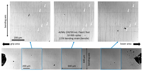 Cyclic bending tests using 90° bending in combination with electrical and optical microscopy evaluation were performed on two bending devices (Figure 3a,b). The applied tensile bending strain was 2.5% using a 2.5 mm radius grip for 10,000 cycles. The thickness of the tested films was negligible to the bending strain. A brittle 300 nm thick Mo film and a less brittle 130/50 nm Al/Mo bilayer on 125 µm thick polymer substrates were tested. To ensure a sufficient statistical measurement, 10 to 12 samples of each film type were tested per device.
