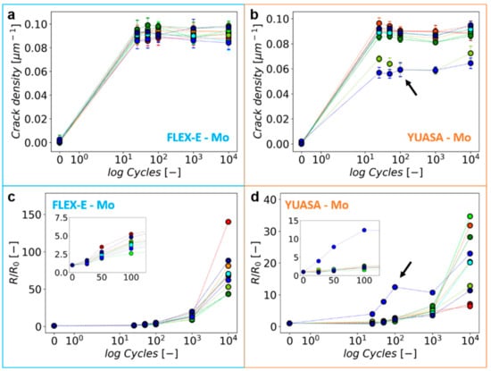 After 25 bending cycles of the single Mo films on polyimide, samples tested on both FLEX-E-TEST and YUASA reach a plateau in the crack density at similar values (Figure 5a,b). The mechanical damage and electrical resistance data are presented similarly to other work [15,27] where in situ resistance measurements were not available. This is not surprising, as the crack density is measured near the grip where damage occurs first; thus, it would reach saturation before the bottom of the damaged area. The FLEX-E-TEST appears to have more uniform statistics with all samples clustering together, while the samples tested on the YUASA have two outliers. Both methods achieve similar damage results for this brittle film system with the average crack density after 10,000 cycles being 1/λ = 0.092 ± 0.002 µm−1 on the FLEX-E-TEST and 1/λ = 0.086 ± 0.003 µm−1 on the YUASA. The resistance data, shown in Figure 5c,d, have a large difference in the scale of the y-axes. FLEX-E-TEST R/R0 does not significantly increase until after 1000 cycles, and after 10,000 cycles, the R/R0 values are approximately between 50 and 150 (Figure 5c). The YUASA samples also show an increase in resistance after about 1000 cycles; however, after 10,000 cycles, the end R/R0 is much lower, only ranging between 5 and 35 (Figure 5d). Of note is that one of the two outlying samples in Figure 5b (marked with arrow) shows average electrical behavior and the other outlier has slightly higher values compared to the other samples clustered together (arrow in Figure 5d). Further examination of the sample found that a scratch oriented in the same direction as the cracks was present from the beginning of the experiments, which could be the reason for the different behavior of this sample. Figure 5 also points out the need to test many samples. If only three samples were tested, erroneous average behavior could be reported. Additionally, Figure 5 shows that the resistance results could be influenced by the speed of the testing since the samples tested with the FLEX-E-TEST have a much higher R/R0 range and most likely infer more damage due to spring back of the sample.
