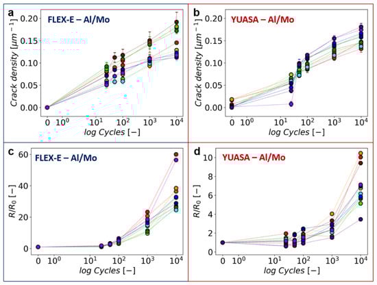 The Al/Mo bilayers demonstrate a very different behavior compared to the single Mo film during intermittent bending. Starting again with the samples tested in the FLEX-E-TEST, all 10 samples illustrate a steady increase in the damage density with no saturation or plateau (Figure 6a, note the semi-logarithmic scale). The spread of the samples is quite large with the final damage density ranging from 0.1 µm−1 to almost 0.2 µm−1 compared to the single Mo film. There also appears to be two clusters of sample behavior after 10,000 cycles. All of the samples tested in the YUASA have a jump between 25 and 50 cycles in the damage density data (Figure 6b). Currently, it is not known why or how this jump manifests in the mechanical data, but the fact that it occurs for all 10 samples tested suggests it could be an artifact from the testing apparatus, but not the intermittent testing method, since the same jump was not observed in any of the FLEX-E-TEST experiments. After 10,000 bending cycles, the damage density of the YUASA samples is slightly lower than the FLEX-E-TEST with values between 0.12 µm−1 and 0.18 µm−1. The higher damage density in the Al/Mo bilayers means that the average damage spacing is slightly smaller compared to the single Mo layers. This result is logical due to the fact that the Al/Mo bilayer total thickness is less than that of the single, 300 nm Mo film system. The electrical resistance increases at a similar rate in the Al/Mo bilayers as in the single Mo film; however, the mechanical damage in the Al/Mo system causes the resistance ratio to increase between 50 and 100 bending cycles (Figure 6c,d). Again, the reader should note the different scales on the y-axes. FLEX-E-TEST samples (Figure 6c) all follow the same trend up to the maximum applied cycles, with two outlying samples. The YUASA samples (Figure 6d) also have the increasing trend, but the individual sample behavior can be observed more easily due to the overall lower R/R0 increase. Again, the significant difference of R/R0 in the FLEX-E-TEST and YUASA could be due to the speed of the testing and the additional spring back the FLEX-E-TEST samples are subjected to.