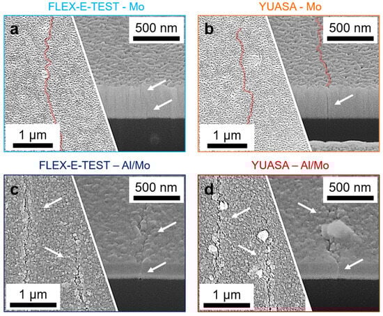 Representative SEM micrographs of the Mo (a,b) and Al/Mo (c,d) films after 10,000 bending cycles, tested with the FLEX-E-TEST (a,c) and the YUASA test (b,d). Surface images are on the left side and the cross-sectional area is displayed on the right side. Cracks are marked by red highlights and white arrows (color online).