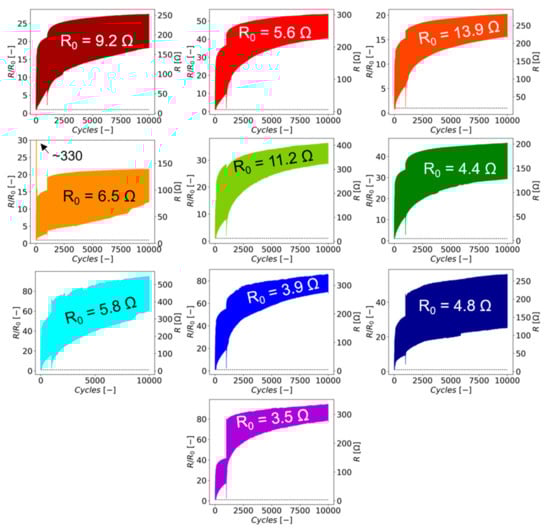 Since the YUASA system is capable of measuring the resistance in situ during bending, a closer look at what can be learned from these data was performed. Figure 8 contains the in situ resistance data for every Mo/PI sample tested in the form of R/R0 (left y-axis) and R (right y-axis). What might be surprising is that almost every sample has a different initial resistance and electrical response to the bending. No two samples behave the same even though all samples were pre-cut to avoid film cracking due to cutting from one large piece and were made at the same time in the same deposition system during the same deposition run. The only difference is the position in the chamber where each sample originated and could be a source for inhomogeneous film thicknesses. However, the film thickness distribution on samples positioned on different sites of the 600 mm × 600 mm substrate carrier was thoroughly investigated [30], and only the center of the deposition area with a manufacturer-certified ±5% thickness accuracy was utilized to achieve as close to uniform film thickness as possible. The graphs in Figure 8 contain all of the data obtained the intermittent testing, and discrepancies in the data (jumps or outlying data points) sometimes occur due to combining the data (from combining the data between cycles). Another source of the jumps in the resistance data could be from the viscoelastic recovery in the PI during intermittent measurements. Additionally, the data shown in each graph are the electrical response during loading (maximum values, peaks) and unloading (minimum values, valleys). The maximum values (peaks) are when the sample is in the folded condition with open cracks and the minimum values (valleys) are when the sample is in the unfolded position with closed cracks. The cracks in this condition can still conduct as demonstrated by Gebhart et al. [28].